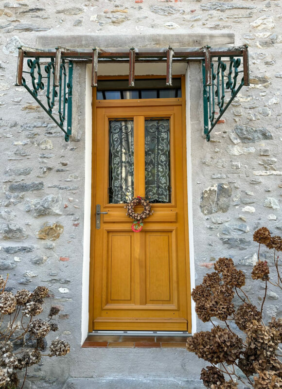 La nouvelle porte transforme l’entrée tout en respectant parfaitement le caractère de cette bâtisse en pierre.