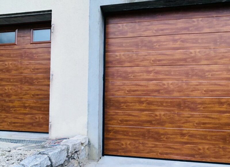 Les portes sectionnelles s’intègrent parfaitement dans l’architecture existante grâce à leur design soigné, ici avec une finition aspect bois, qui apporte chaleur et élégance à l’ensemble.