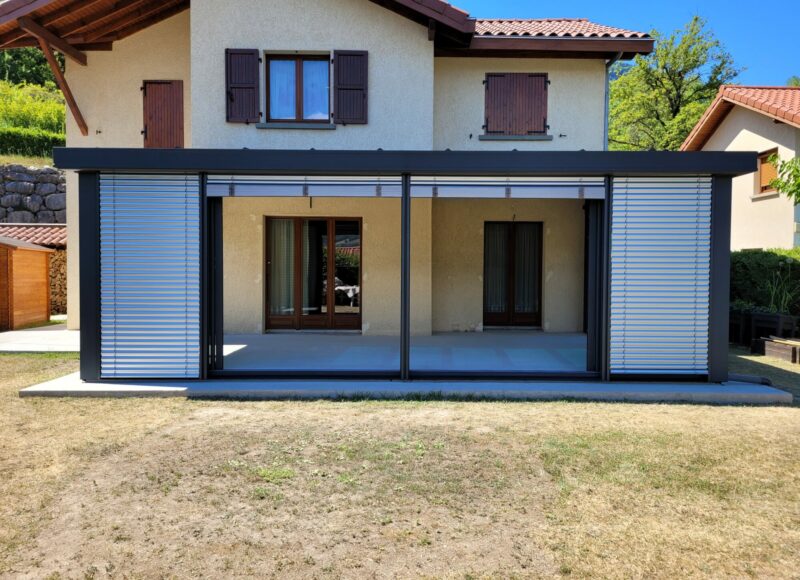 Entre la qualité de l’isolation, la gestion de l’ensoleillement grâce aux brise-soleil orientables et les larges ouvertures vitrées, cette véranda offre un espace agréable à vivre en toute saison, tout en valorisant l’architecture de la maison.
