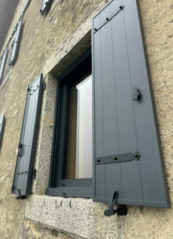 La teinte des volets et les ferrures visibles s’intègrent harmonieusement à l’ensemble de la façade et aux encadrements de fenêtres existants.