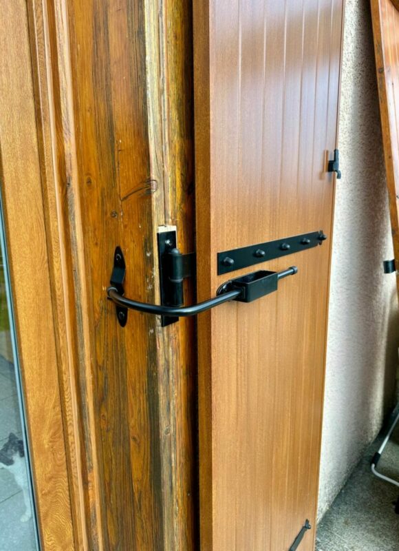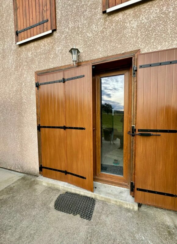 Leur teinte bois s’harmonise naturellement avec les menuiseries existantes et la façade du bâtiment. Les ferrures et accessoires noirs viennent souligner l’aspect traditionnel des volets et apportent une finition soignée à l’ensemble.